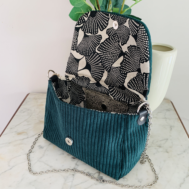 Grâce à sa chaînette, le sac peut se porter en bandoulière ou à l’épaule, selon la façon dont elle est attachée. Il se ferme à l’aide d’un bouton aimanté, pratique et discret.